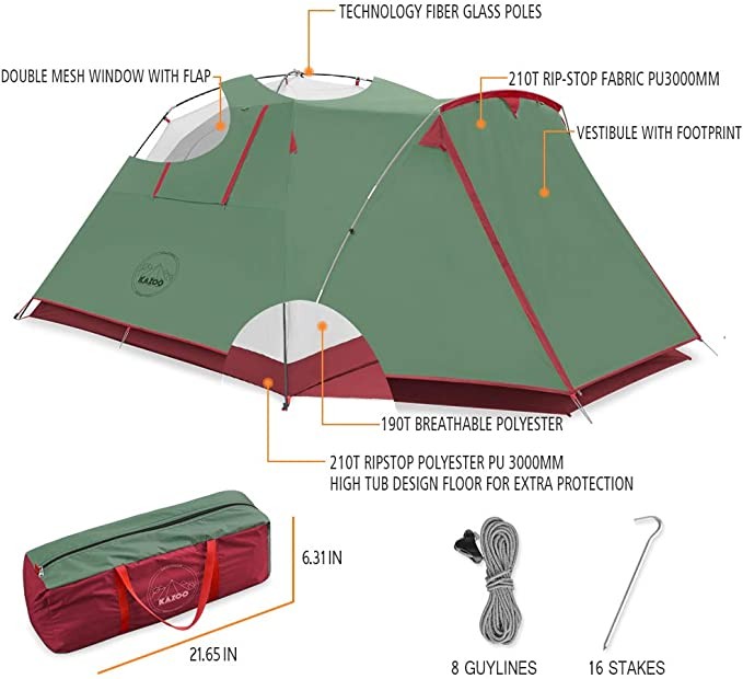 KAZOO 4 Person Camping Tent Outdoor Waterproof Family Large Tent 4 Person Easy Setup Tent with Porch Double Layer