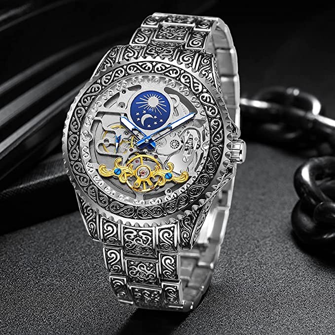 Mechanical Men's Watch Fashion Automatic Men's Clock Blue Stainless Steel Waterproof Business Skeleton Watch