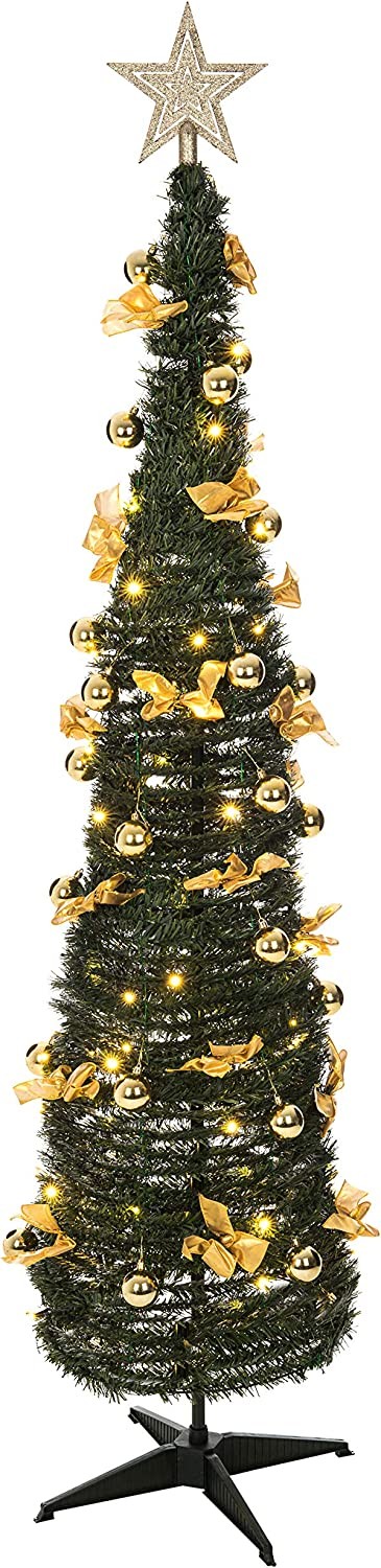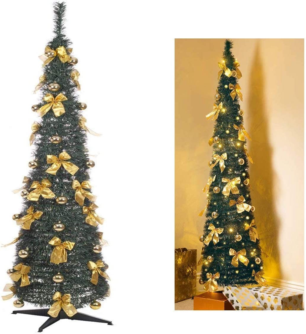 FiNeWaY 6FT / 180cm Green Pop Up Xmas Tree With Pre Lit 60 LED - With Golden Bows, Baubles - Decorated Christmas Lighted Tree - Festive Season - Energy Efficient Long Lasting LEDs – For Home Office